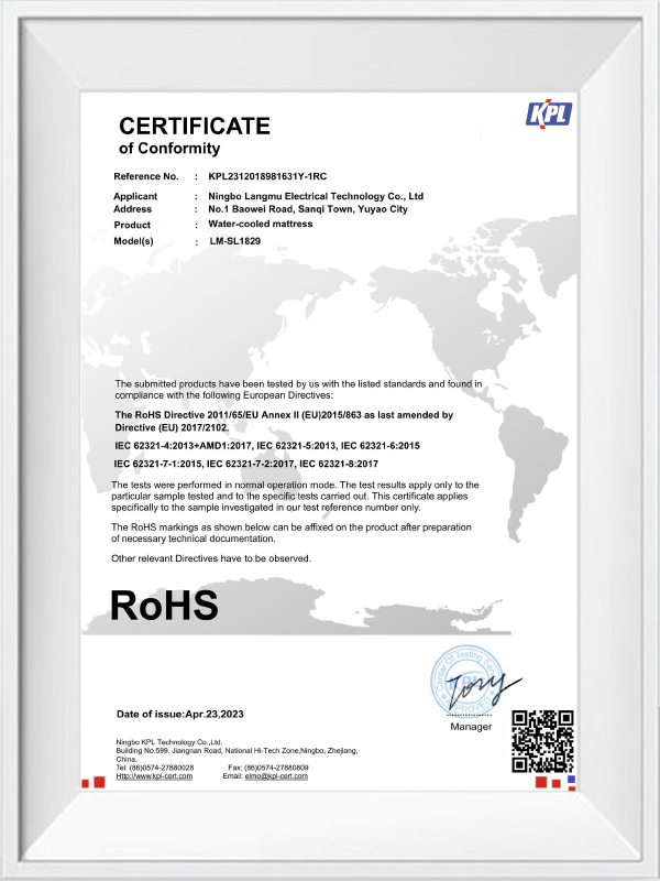 Společnost prošla certifikací systému řízení kvality ISO9001: 2015. Vodě chlazená matrace má certifikaci CE a matrace s vodou má certifikaci ETL a má více patentů. Kvalita je důvěryhodná.